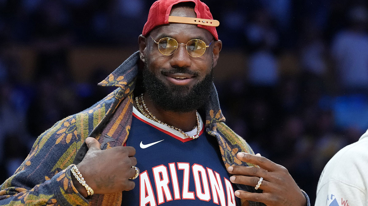 James is expected to miss the first month of the season with sciatica, but that hasn’t stopped the cameras from rolling around moving to him on the bench. When he was introduced during the Lakers’ second game of the season, fans noticed the Arizona colors under his colorful jacket.