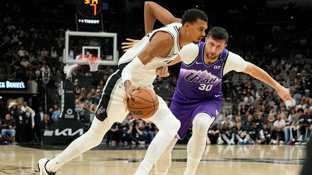 San Antonio Spurs forvat Victor Vigeniama (1) Forbidden Utah Jazz Center Jusuf Nurkić (30) During the first half in the Bank Bank Centur.