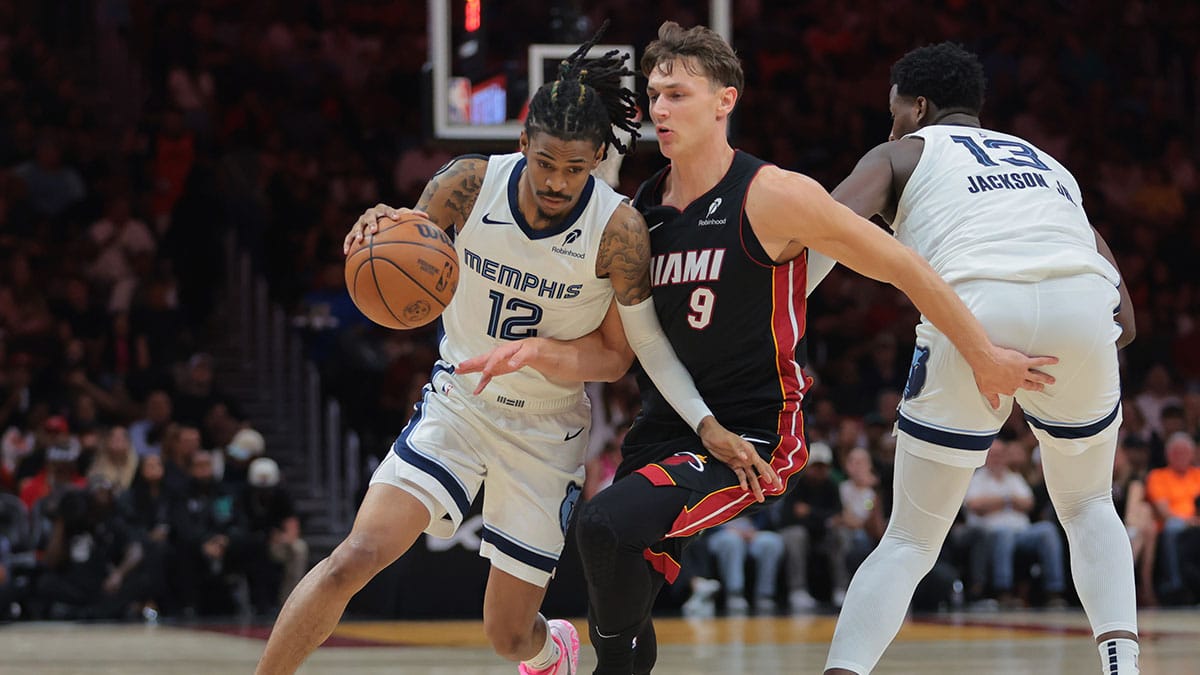 Memphis Grizzlies Guard Ja Morant (12) Passes basketball like Miami Heart Guard Pelle Larsson (9) is prohibited during the second quarter in the Cashier Center.