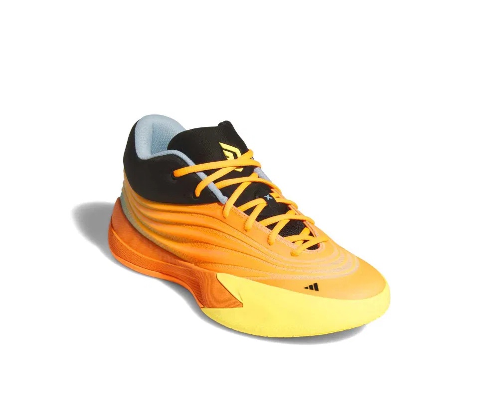 The upper comes in orange, complete with a black collar and yellow front. The player logo and adidas three stripes appear in yellow on a black background on the tongue and heel.