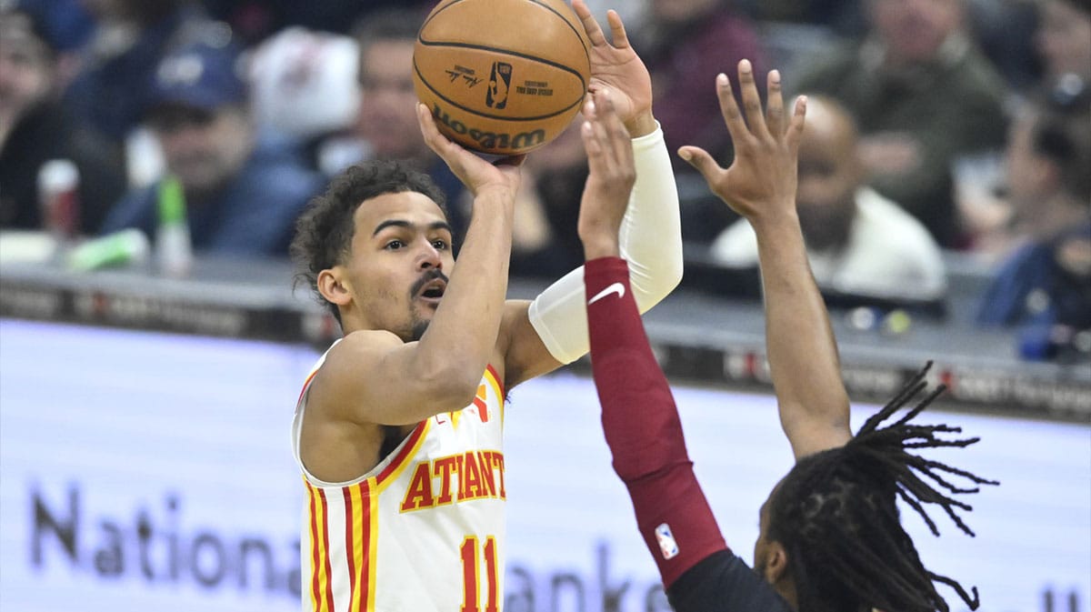 Atlanta Hawks Guard Trae Young (11) makes a three-point basket during the first quarter against Brooklyn networks in the center of Barclays.