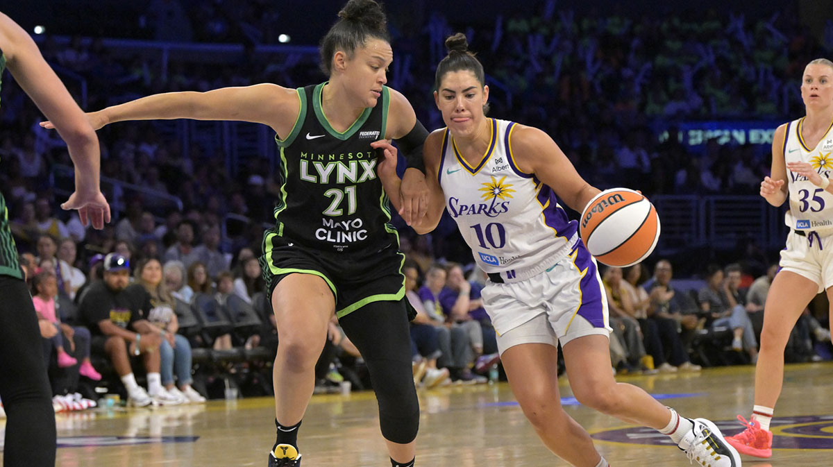 Los Angeles Sparks Guard Kelsei Plum (10) Drive Minnesota Link Guard Kaila McBride (21) in the second half at the Cripto.com Arena.